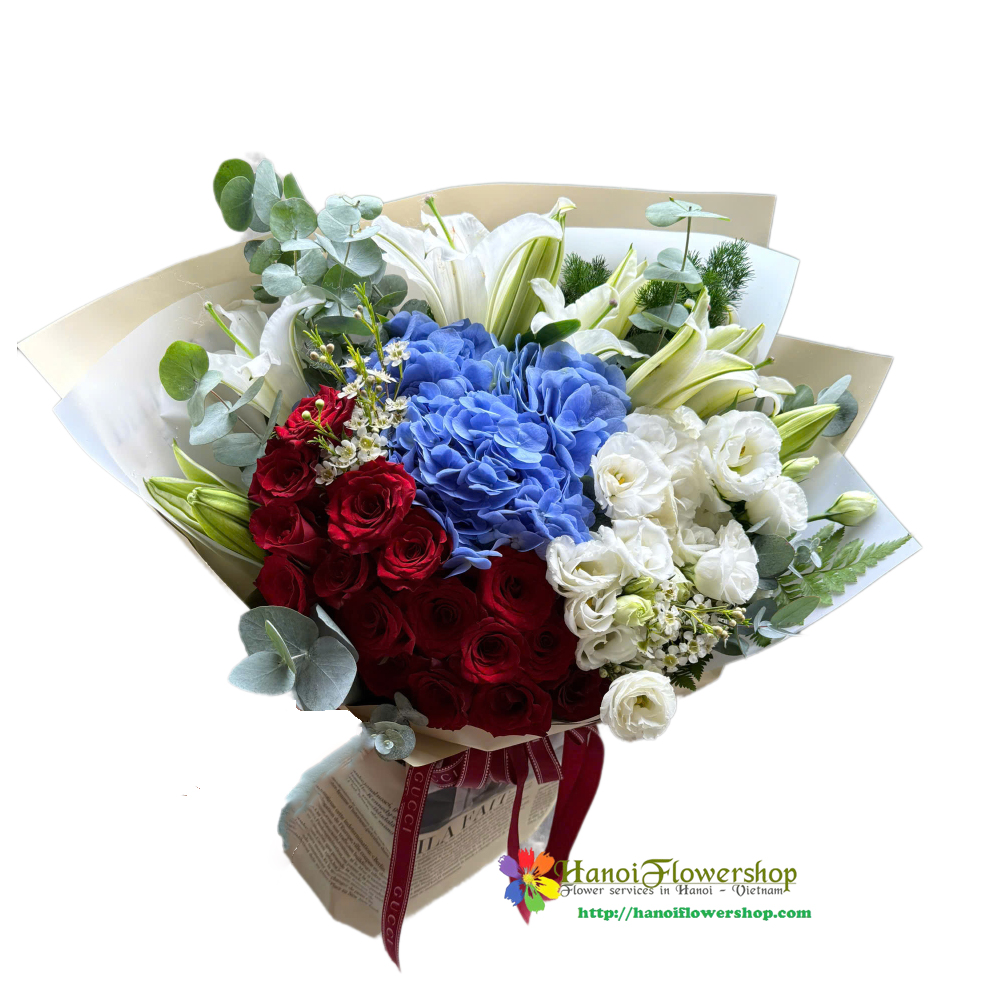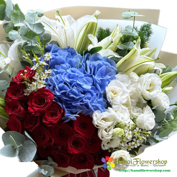 | Kind of flowers | Red roses, white lilies, white lisianthus, blue hydrangeas |